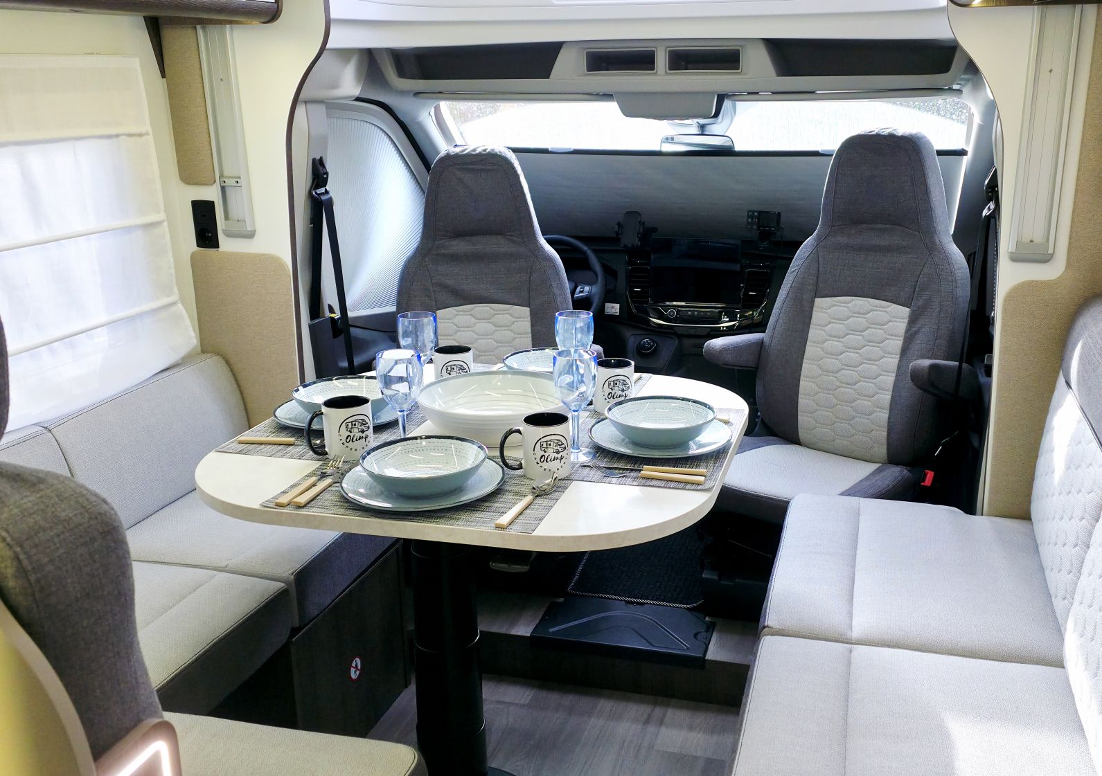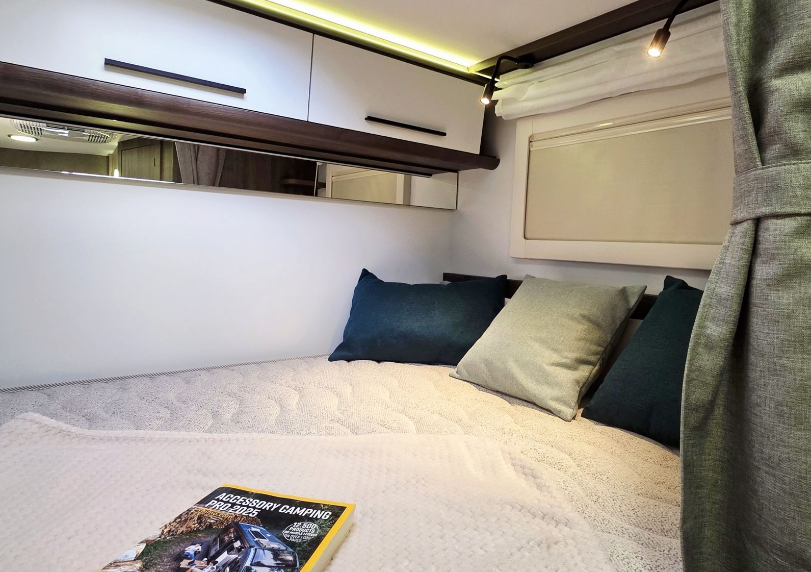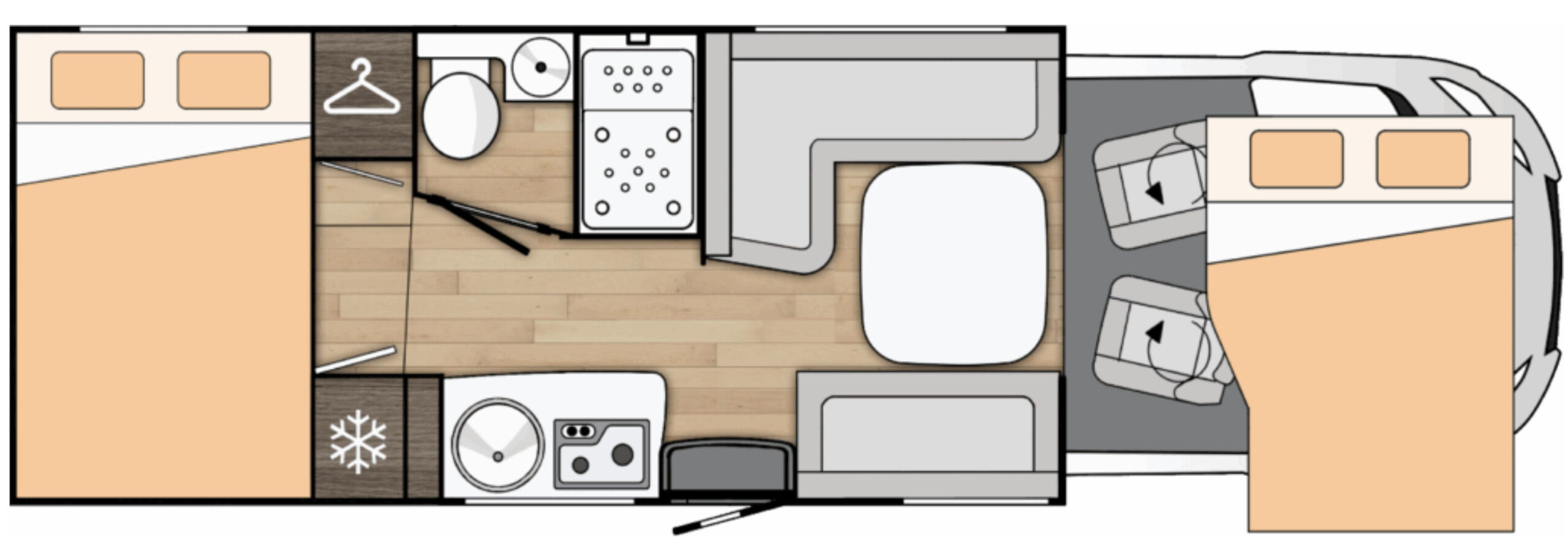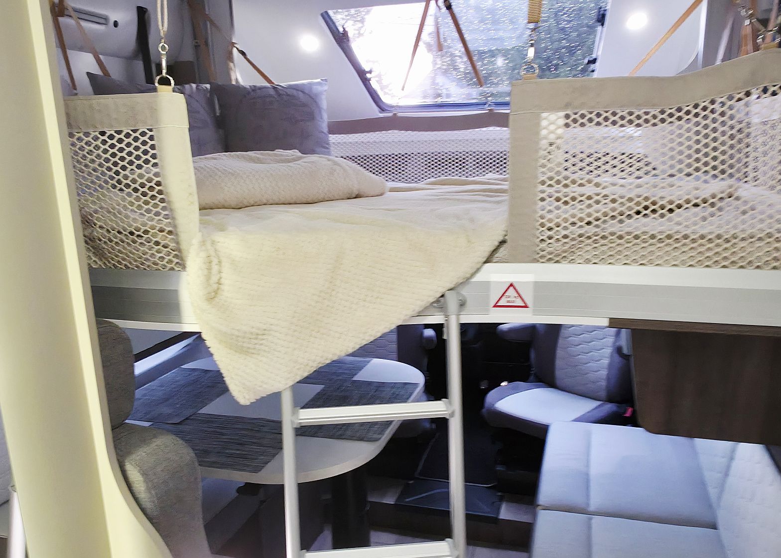 | Łóżka | opuszczane łóżko nad salonem 140x 191 cm, łóżko z tyłu 140x 215 cm, oraz łóżko w salonie po opuszczeniu stołu i dołożeniu dodatkowych materacy |