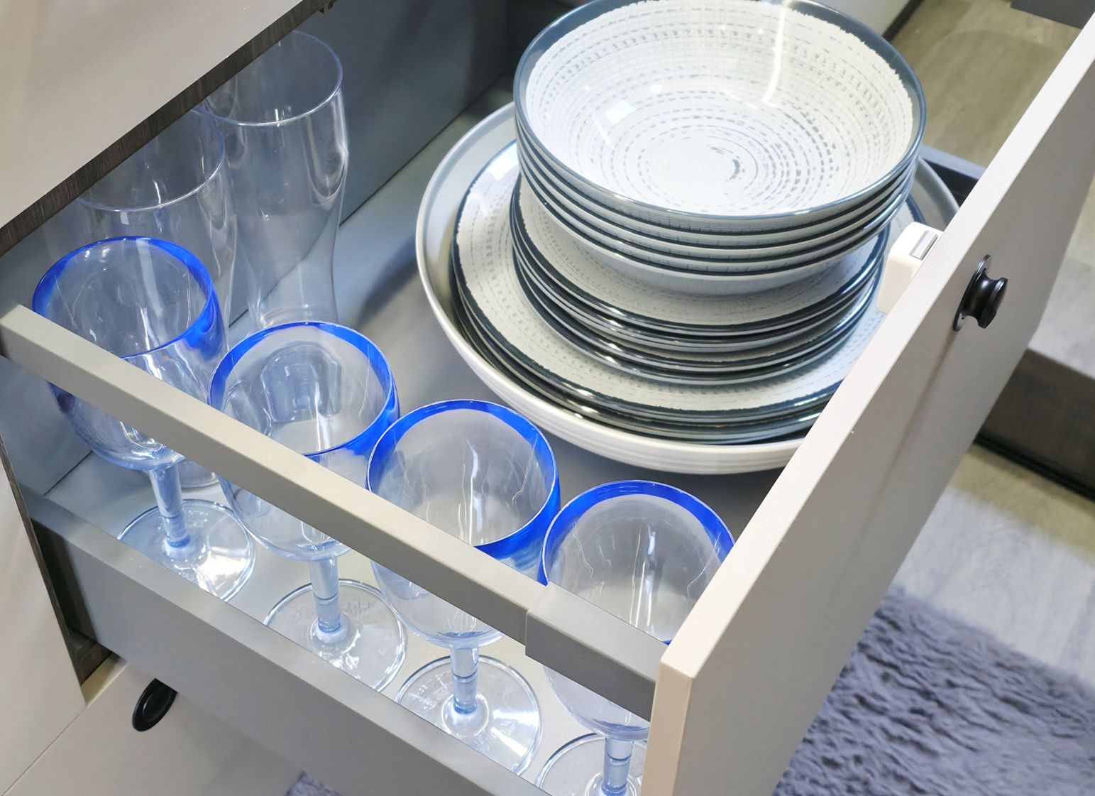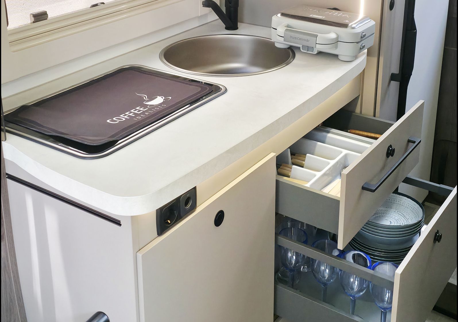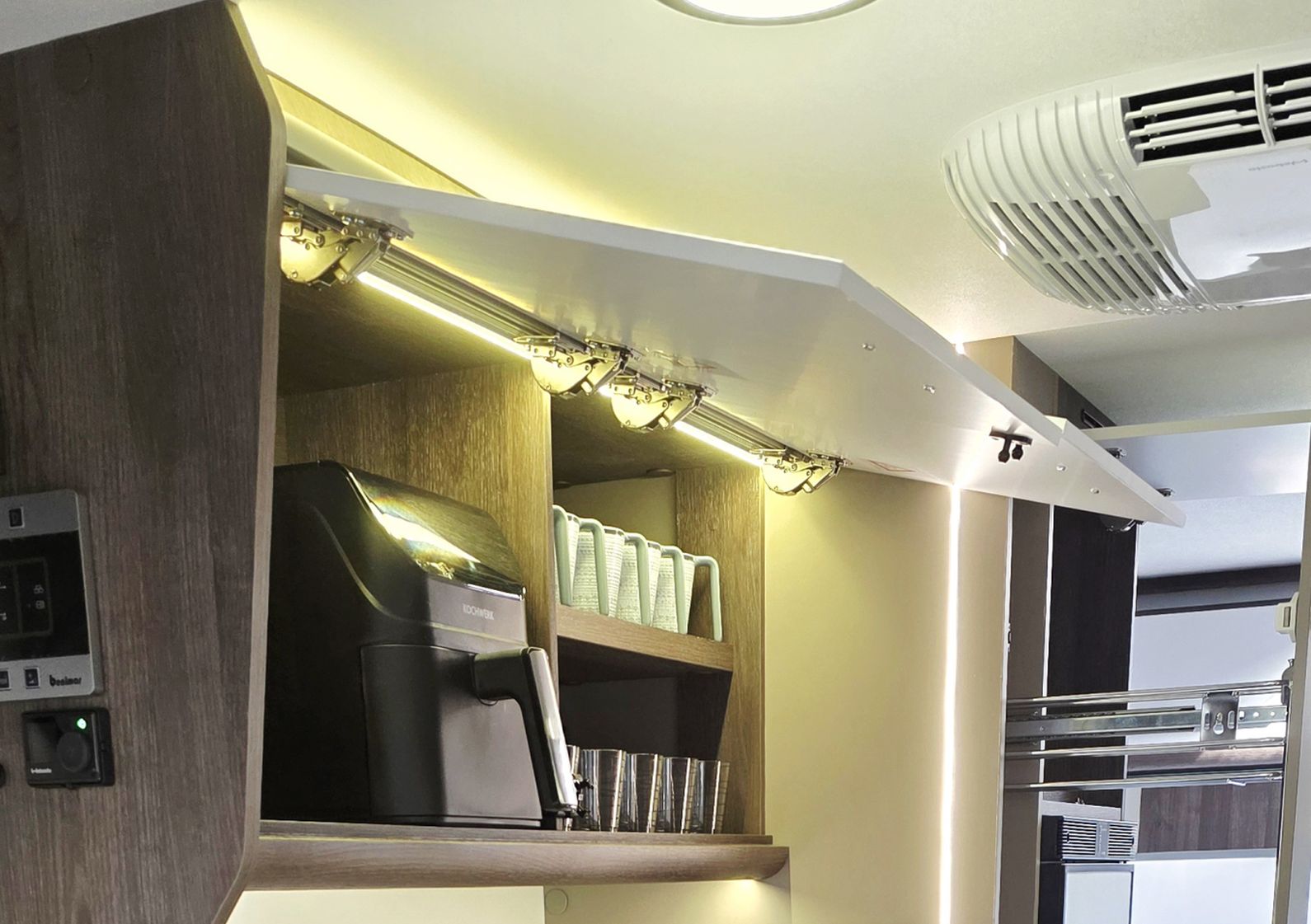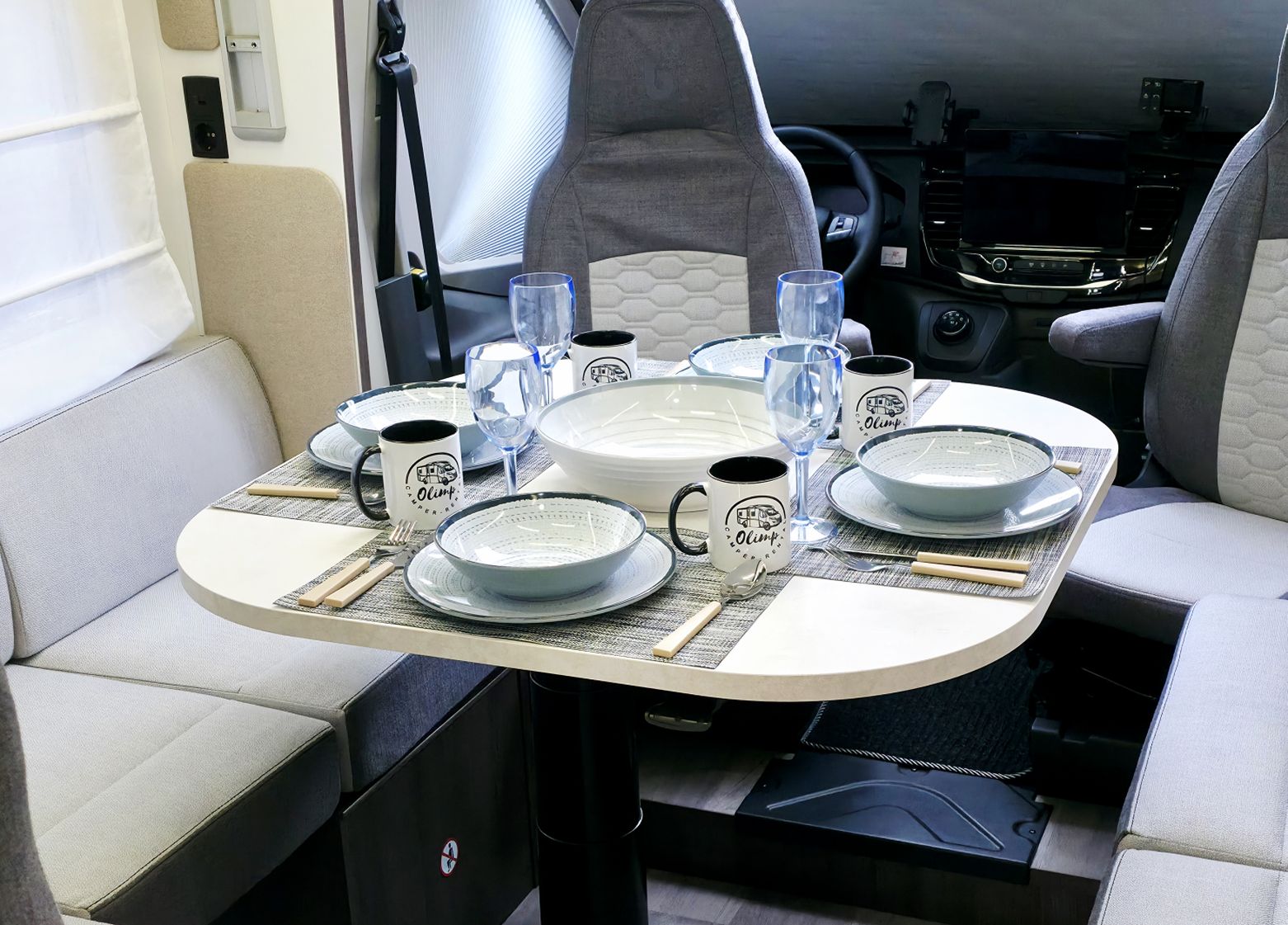 | Łóżka | opuszczane łóżko nad salonem 140x 191 cm, łóżko z tyłu 140x 215 cm, oraz łóżko w salonie po opuszczeniu stołu i dołożeniu dodatkowych materacy |